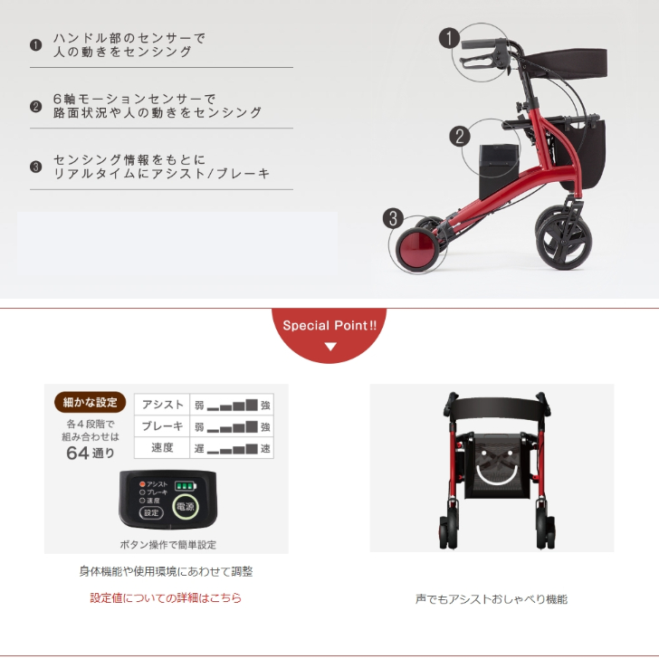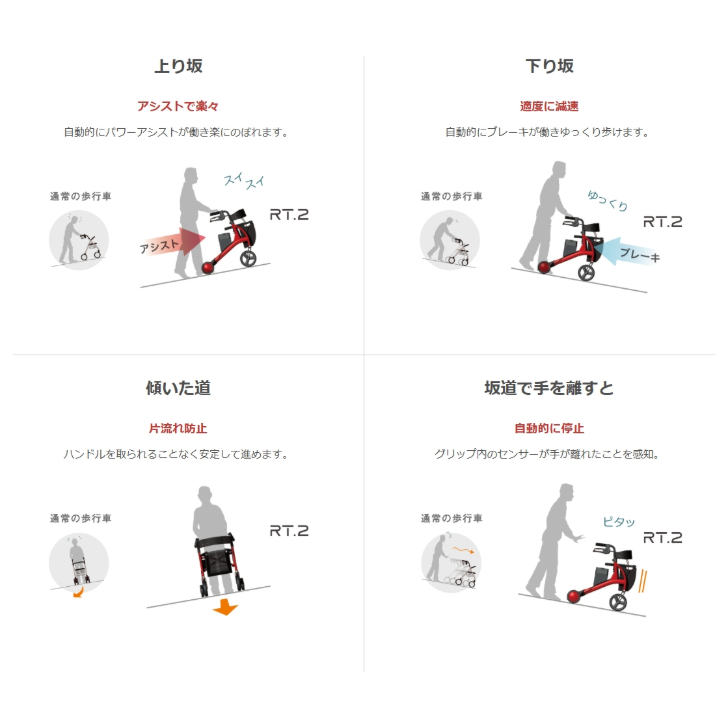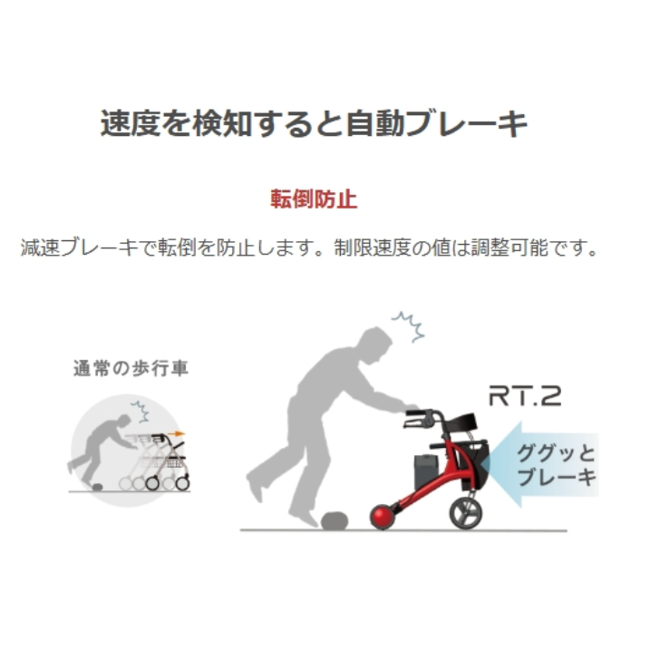 転倒防止・・・減速ブレーキで転倒を防止します。制限速度の値は調整可能です。